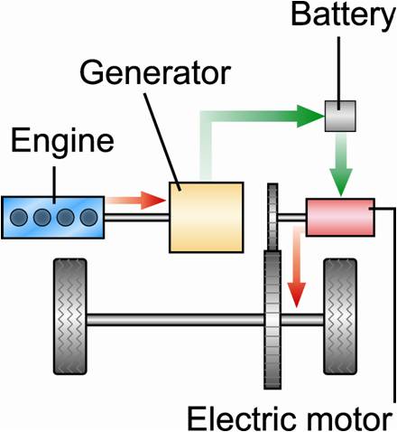 Engine menggerakkan generator, dan Motor listrik menggunakan tenaga listrik yang dihasilkan untuk menggerakkan roda. Ini disebut sistem hybrid seri karena aliran daya ke roda secara seri, yaitu, tenaga mesin dan motor listrik berada dalam sistem series. Sistem hybrid seri dapat berjalan dengan output yang kecil engine dengan operasional yang efisien relatif stabil, membangkitkan dan mensuplai energi listrik ke motor listrik dan secara efisien mengisi baterai. Ia memiliki dua motor-yaitu sebuah generator yang memiliki struktur yang sama seperti motor listrik dan motor sebuah motor listrik. Sistem ini sedang digunakan dalam Coaster Hybrid.
